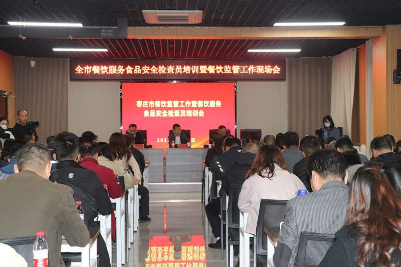 為進(jìn)一步豐富餐飲服務(wù)食品安全檢查員業(yè)務(wù)知識,提升全市餐飲環(huán)節(jié)食品安全監(jiān)管水平,棗莊市市場監(jiān)督管理局根據(jù)2023年餐飲監(jiān)管工作計劃,于11月8日,在臺兒莊古城學(xué)校召開全市餐飲監(jiān)管工作暨餐飲服務(wù)食品安全檢查員培訓(xùn)會議,市、區(qū)兩級局分管局長、餐飲科全體人員、全市餐飲服務(wù)食品安全檢查員參加。會議由市市場監(jiān)管局副局長張衍耀主持;臺兒莊區(qū)委常委、副區(qū)長孫作偉致辭,并介紹建設(shè)“食安臺兒莊”的經(jīng)驗(yàn)和做法;山東省市場監(jiān)管局餐飲處一級調(diào)研員遲玉聚博士,作《深刻學(xué)習(xí)領(lǐng)會習(xí)近平總書記重要論述精神努力守住食品安全底線》主題報告。