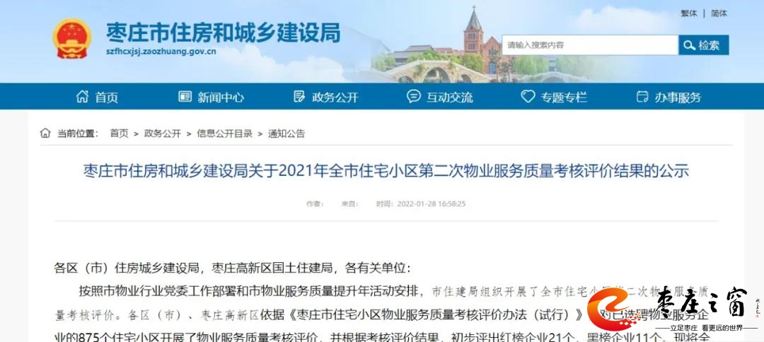 近日棗莊市住房和城鄉(xiāng)建設(shè)局發(fā)布《關(guān)于2021年全市住宅小區(qū)第二次物業(yè)服務(wù)質(zhì)量考核評價結(jié)果的公示》